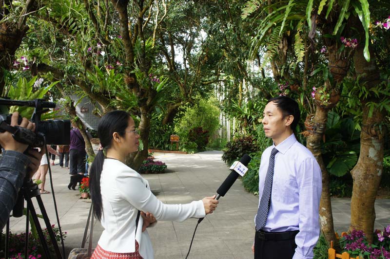 香饮所谭乐和副所长向万宁电视台记者介绍兴隆热带植物园春节科普讲解工作情况